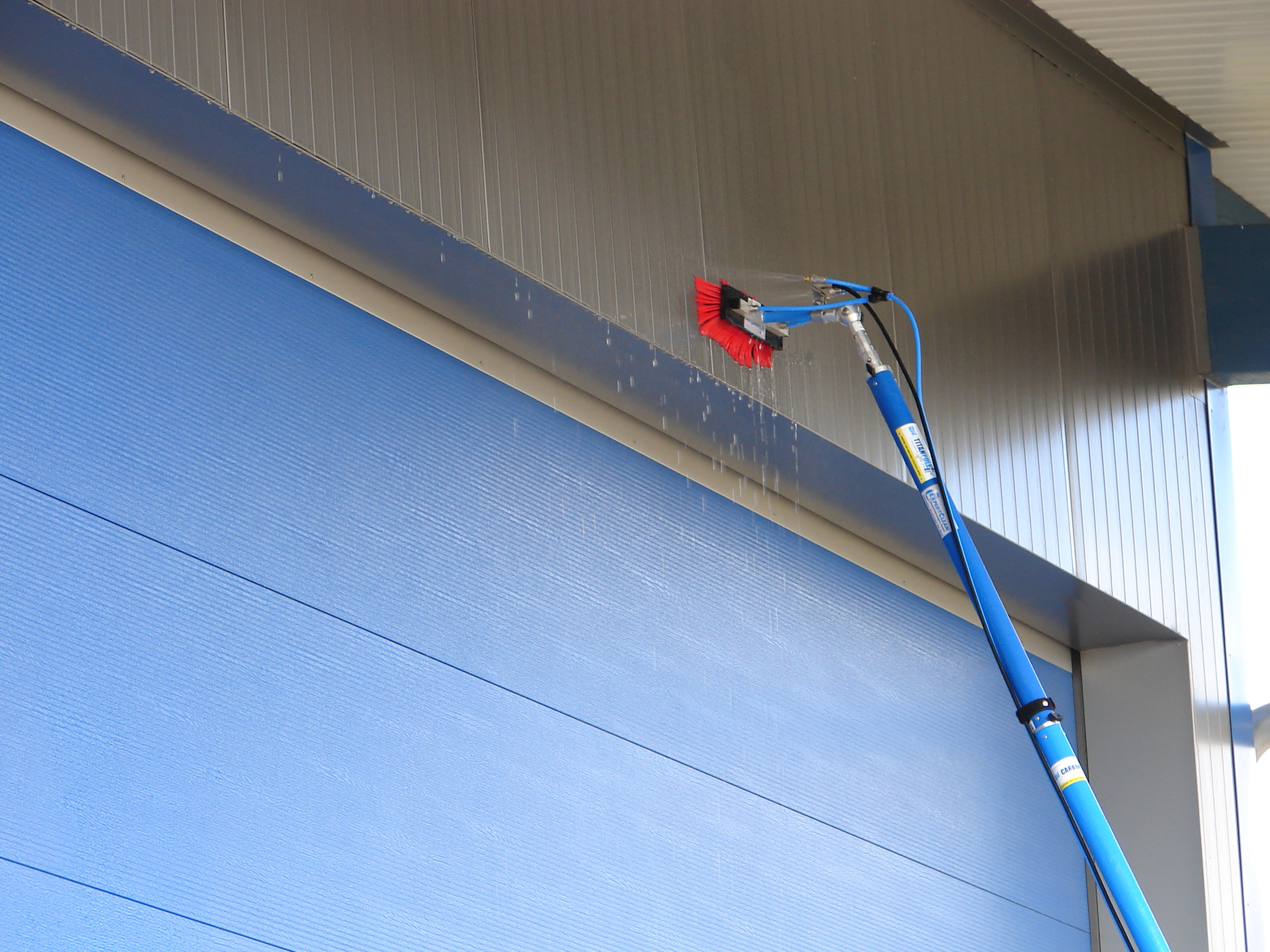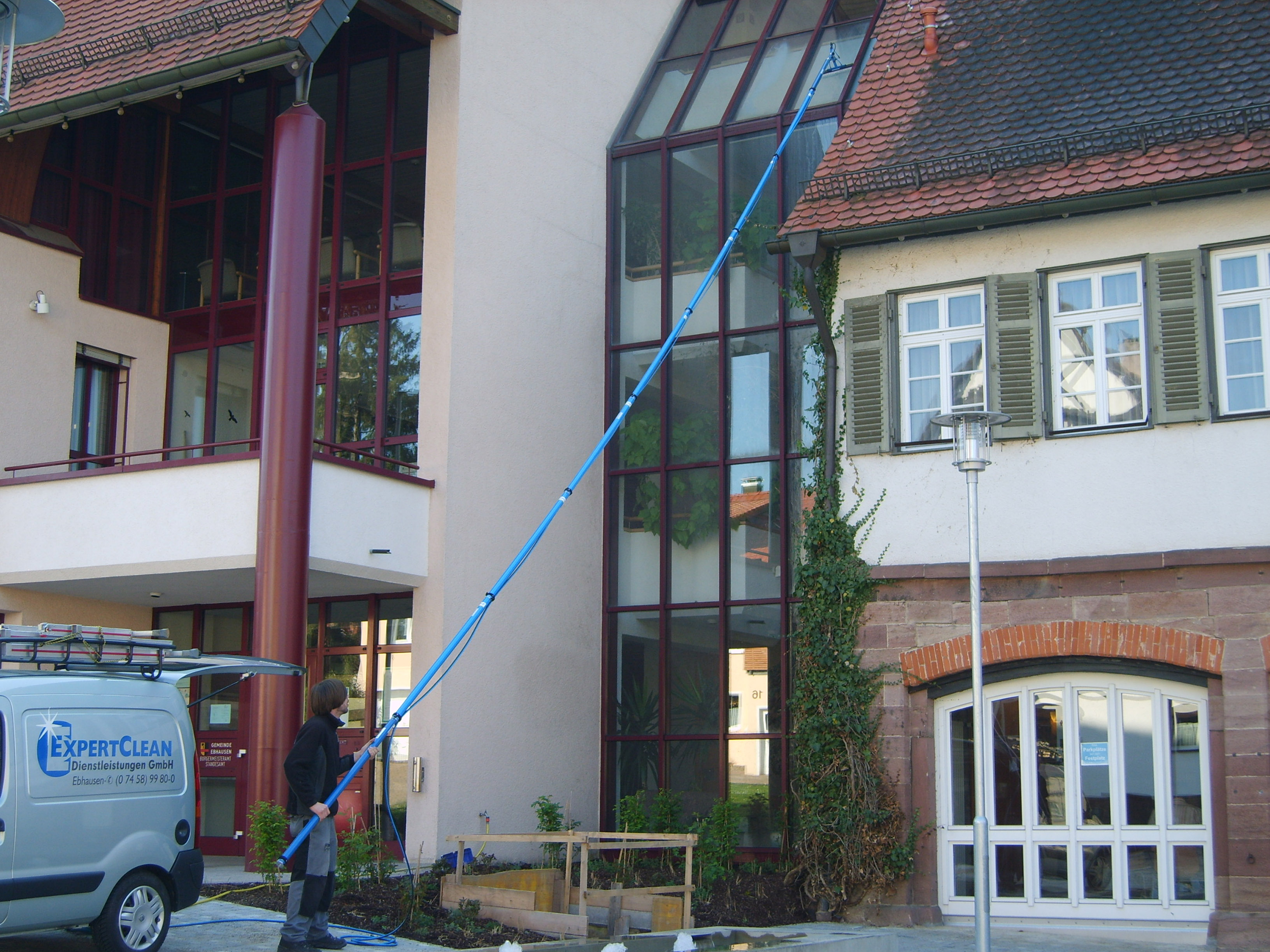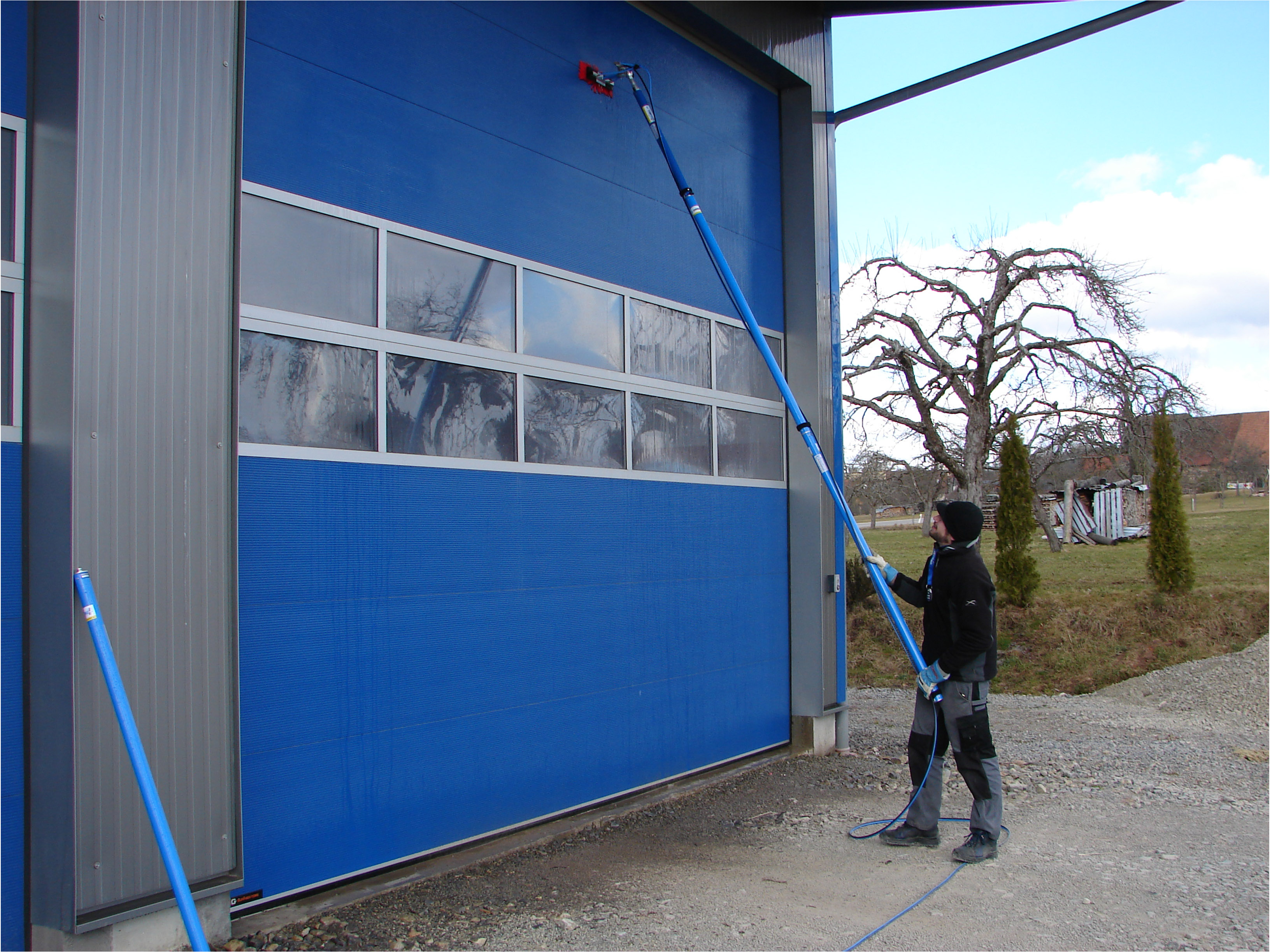 Puraqleen® ist ein professionelles System zur Glasfassaden-Reinigung. Hierbei werden mit leichten Carbon- und Titanstangen schwer zugängliche, hohe Glasfassaden und andere Flächen sicher vom Boden aus gereinigt. Die Reinigung der verschmutzten Flächen geschieht durch die Spülung mit entmineralisiertem, reinem Wasser. Die Umwandlung des einfachen Leitungswassers in mineralfreies Wasser findet über eine mobile Technik direkt vor Ort statt. Die Anlage leitet das Wasser durch eine mit Mischbettharz gefüllte Flasche und pumpt es anschließend zur gewünschten Arbeitshöhe. Über ein ausgefeiltes Bürsten-Sprühsystem wird das reine Wasser auf die zu reinigenden Flächen mit max. 5 bar Druck gebracht. Die Flächen werden dabei mit Unterstützung der Bürsten abgespült.